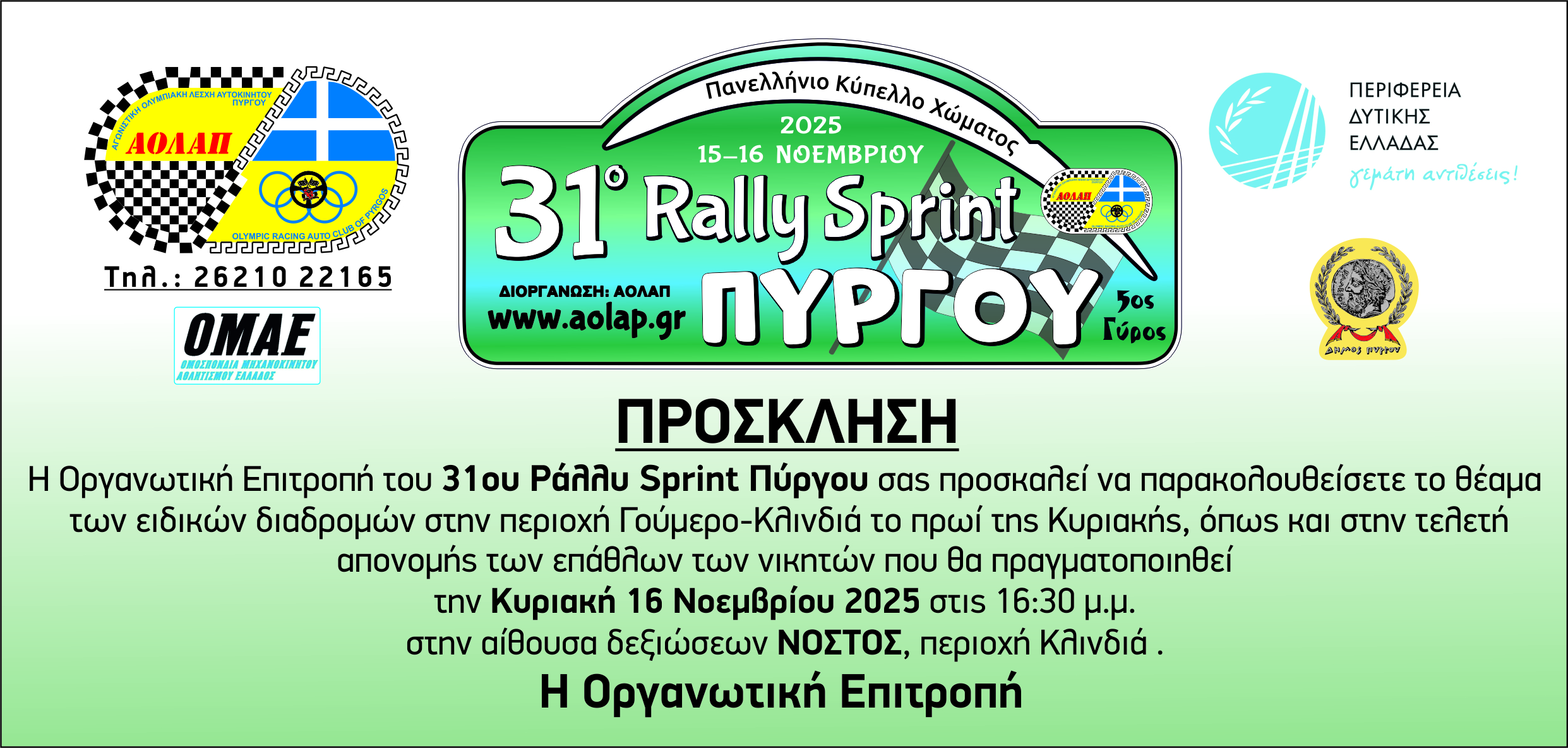 Σε εύκολη υπόθεση εξελίχθηκε το 31ο Ράλλυ Σπριντ Πύργου για τους Ιωάννη Παπαδημητρίου-Χρήστο Κουζιώνη, οι οποίοι αναδείχθηκαν νικητές στον αγώνα που έριξε την αυλαία του Κυπέλλου Ράλλυ Χώματος. Το 31ο Ράλλυ Σπριντ Πύργου έλαβε χώρα το διήμερο 15 και 16 Νοεμβρίου στην απαιτητική, όπως αποδείχθηκε, Ειδική Διαδρομή «Γούμερο-Κλινδιά», όπου τα πληρώματα πραγματοποίησαν τρία περάσματα. Ο…