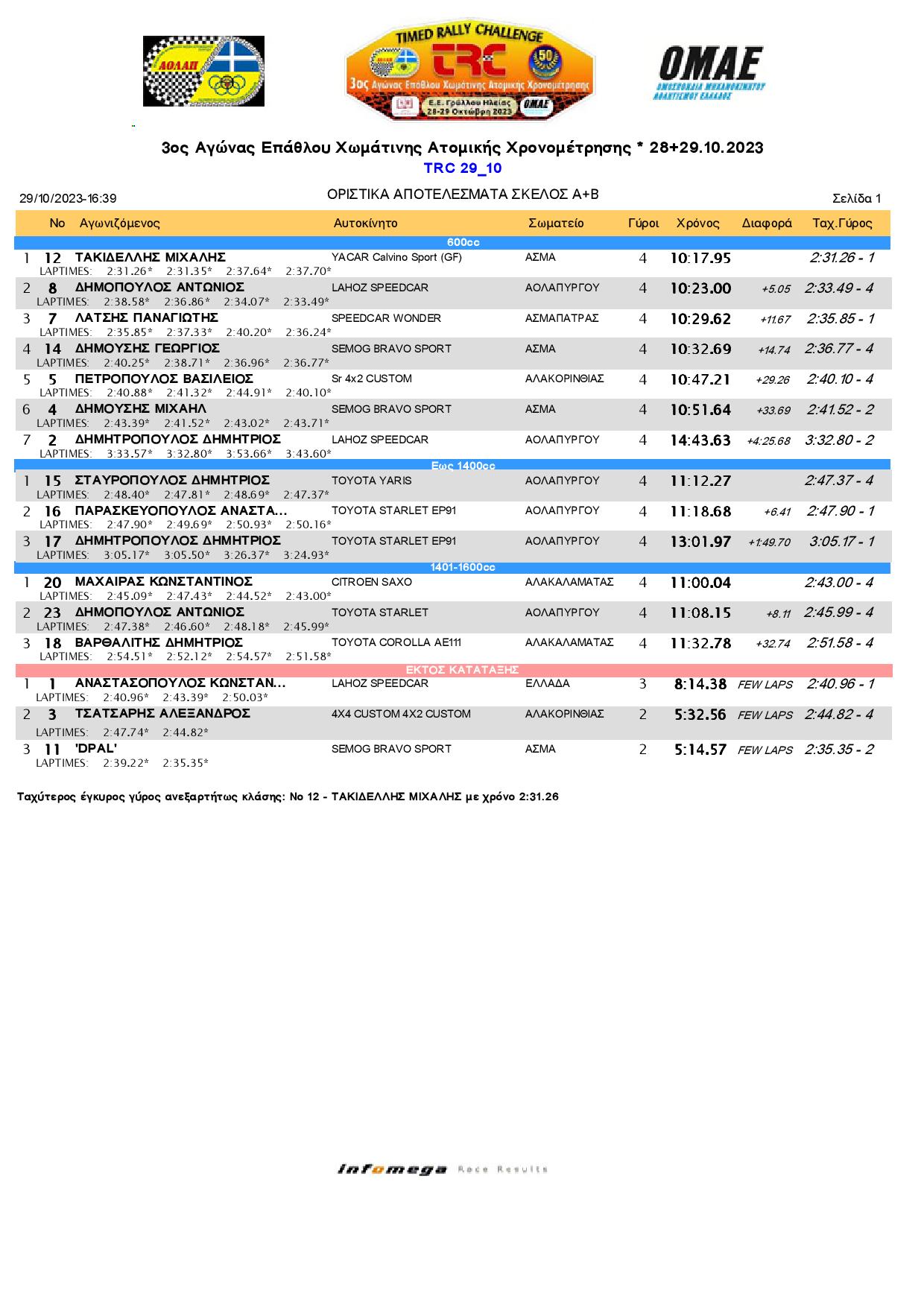 Στο αγωνιστικό κομμάτι, ο Μιχάλης Τακιδέλλης ήταν ο ταχύτερος στην κατηγορία 600cc στα kartcross με ένα Yacar Calvino Sport, αφήνοντας τον τοπικό Αντώνη Δημόπουλο με Lahoz Speedcar στη δεύτερη θέση. Ο Παναγιώτης Λάτσης με Speedcar Wonder τερμάτισε τρίτος, εμπρός από τους Γιώργο Δημούση (Semog Bravo Sport), Βασίλη Πετρόπουλο (SR 4×2 Custom), Μιχάλη Δημούση (Semog Bravo Sport) και Δημήτρη Δημητρόπουλο (Lahoz Speedcar). Στην κατηγορία  έως 1400 cc, ο Κυπελλούχος Ελλάδος για το 2023 στην κατηγορία C6, Δημήτρης Σταυρόπουλος (Toyota Yaris) επικράτησε, με τους Αναστάσιο Παρασκευόπουλο (Toyota Starlet EP91) και Δημήτρη Δημητρόπουλο με ίδιο αυτοκίνητο να συμπληρώνουν το βάθρο. Ο Καλαματιανός Κωνσταντίνος Μαχαίρας κέρδισε στην κατηγορία 1401-1600 cc, οδηγώντας ένα Citroen Saxo VTS, με τον Αντώνη Δημόπουλο (Toyota Starlet) να τερματίζει δεύτερος, εμπρός από τον Δημήτρη Βαρθαλίτη (Toyota Corolla AE111).